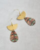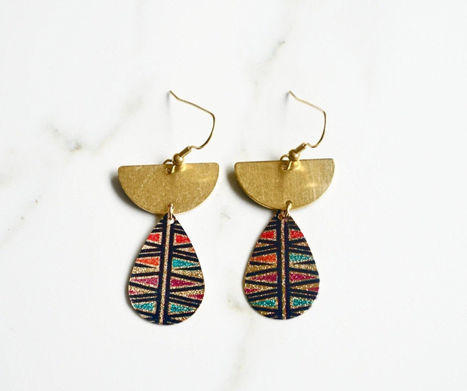 These statement earrings feature half moon brass tops with colorful teardrop etched focals. Lightweight and trendy, a perfect compliment to any outfit.